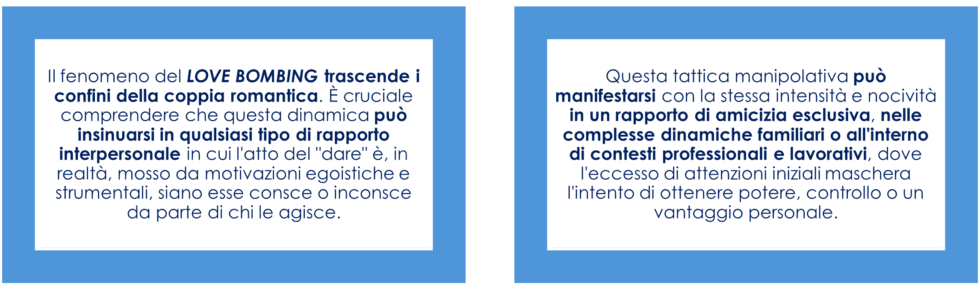 Il love bombing rientra nell’ampio spettro dei comportamenti manipolativi e non autentici, finalizzati a umiliare, controllare e sottomettere il partner.