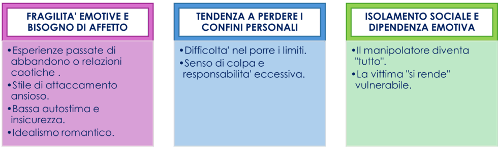 - Stile di attaccamento ansioso: Le prime interazioni con i caregiver (figure significative di riferimento) modellano i propri modelli relazionali futuri, rendendo la Persona altamente vulnerabile all’illusione di un amore perfetto e totalizzante, offerto dal manipolatore.