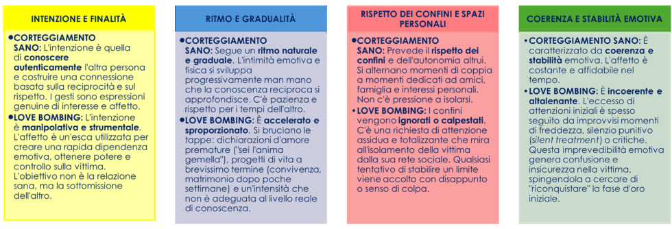 Distinguere tra un corteggiamento sano e il love bombing è fondamentale, poiché le due dinamiche, pur potendo apparire simili in superficie per l’intensità delle attenzioni, hanno intenzioni, ritmi e impatti completamente diversi.