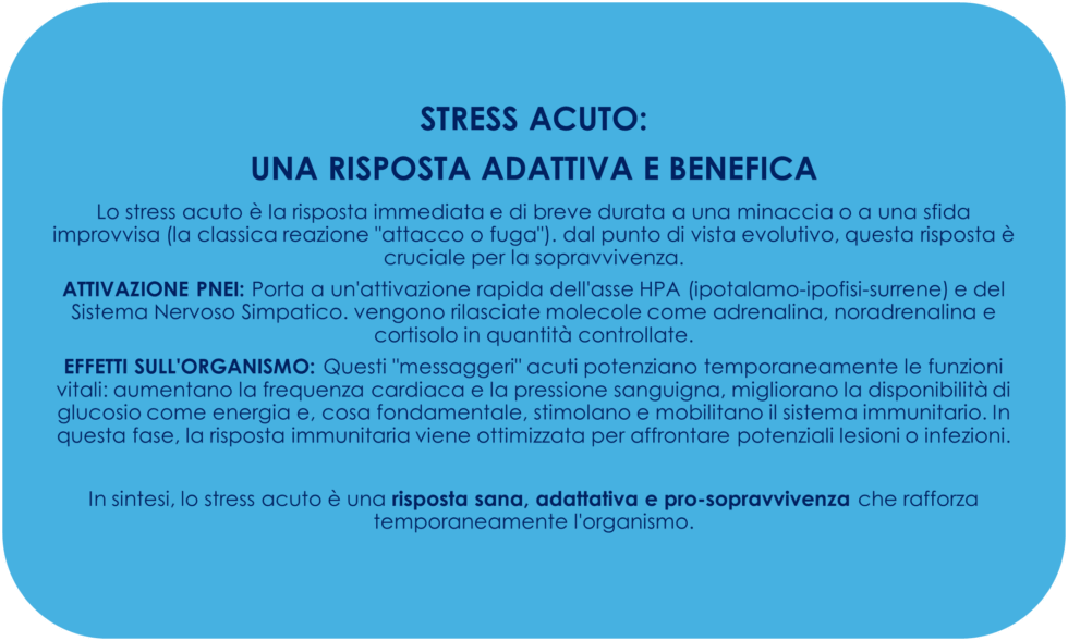 In tal senso, è cruciale distinguere tra stress acuto e stress cronico perché i due tipi di stress hanno effetti diametralmente opposti e distinti sull’organismo e sui suoi sistemi di comunicazione (nervoso, endocrino e immunitario).