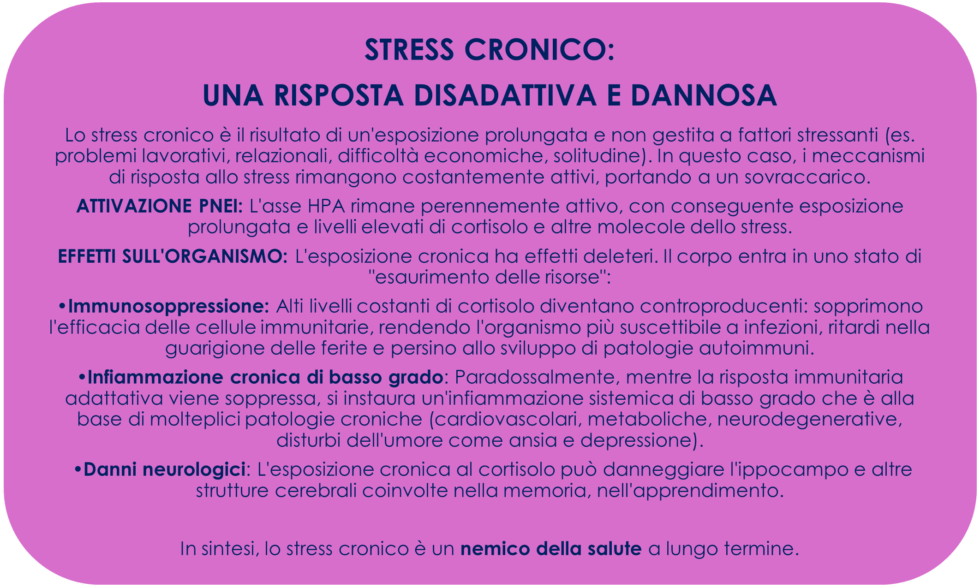 La PNEI sottolinea che la distinzione è cruciale perché non è lo “stress” in sé a essere negativo, ma la sua durata e intensità. Comprendere questa differenza permette di valorizzare la funzione dello stress acuto come meccanismo biologico vitale e identificare e intervenire precocemente sullo stress cronico, che è il vero fattore di rischio per la salute psicofisica, tramite strategie di gestione (es. mindfulness, esercizio fisico, supporto sociale, terapie, etc.).