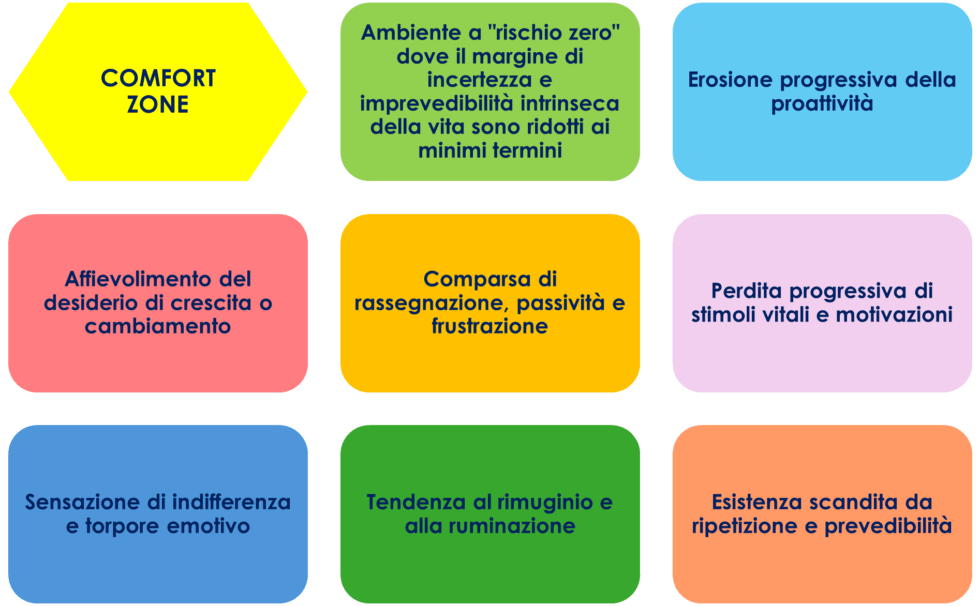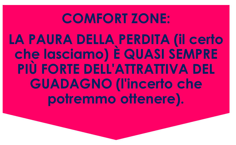 Sono numerose le TAPPE FONDAMENTALI DELLA VITA CHE CI METTONO DI FRONTE AL BIVIO DELLA COMFORT ZONE, costringendoci a scegliere tra la sicurezza del noto e l’incertezza del nuovo. Queste decisioni si presentano come veri e propri salti nel vuoto, momenti in cui il tasso di rischio percepito aumenta notevolmente e la nostra psiche, per proteggerci, alza le sue difese.