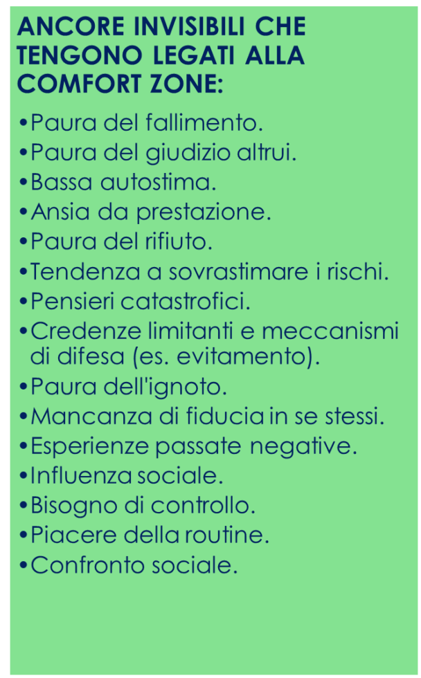 • Esperienze passate negative: Fallimenti o esperienze dolorose avvenute in passato quando si è usciti dalla comfort zone possono creare una forte avversione a ripetersi.