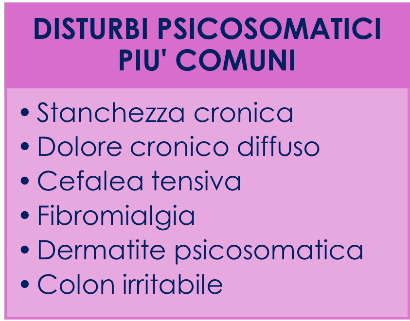 Su base psicosomatica, si possono sviluppare diverse condizioni fisiche che tendono a cronicizzarsi e che spesso si dimostrano resistenti ai trattamenti medici convenzionali, proprio perché la loro radice è psicologica e non puramente organica. Tra i disturbi più comuni che rientrano in questa categoria vi sono: